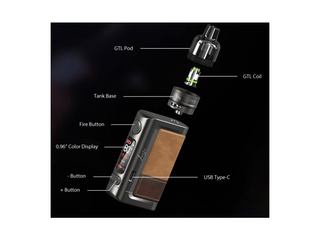 Není určeno pro náplně obsahující nikotin! Eleaf iStick Power 2 je doslova pořádným gripem, a to díky masivní konstrukci těla potažené kůží a vestavěnou baterií o kapacitě 5000mAh s rychlým 2A nabíjením pomocí USB-C portu. Inteligentní čip INSIDE kromě běžného režimu POWER podporuje režimy SMART a VOLTAGE, které mají funkci inteligentního doporučení optimálního výkonu/napětí pro různé odpory žhavících hlav. Barevný TFT 0,96palcový displej nabízí detailní informace o nastavení. Mezi jeho další přednosti patří ochrana proti zkratu, přehřátí, přežhavení, nízkému odporu a 10-ti vteřinová ochrana žhavení. Clearomizer GTL Pod pojme až 4,5ml liquidu... Více info v detailním popisu