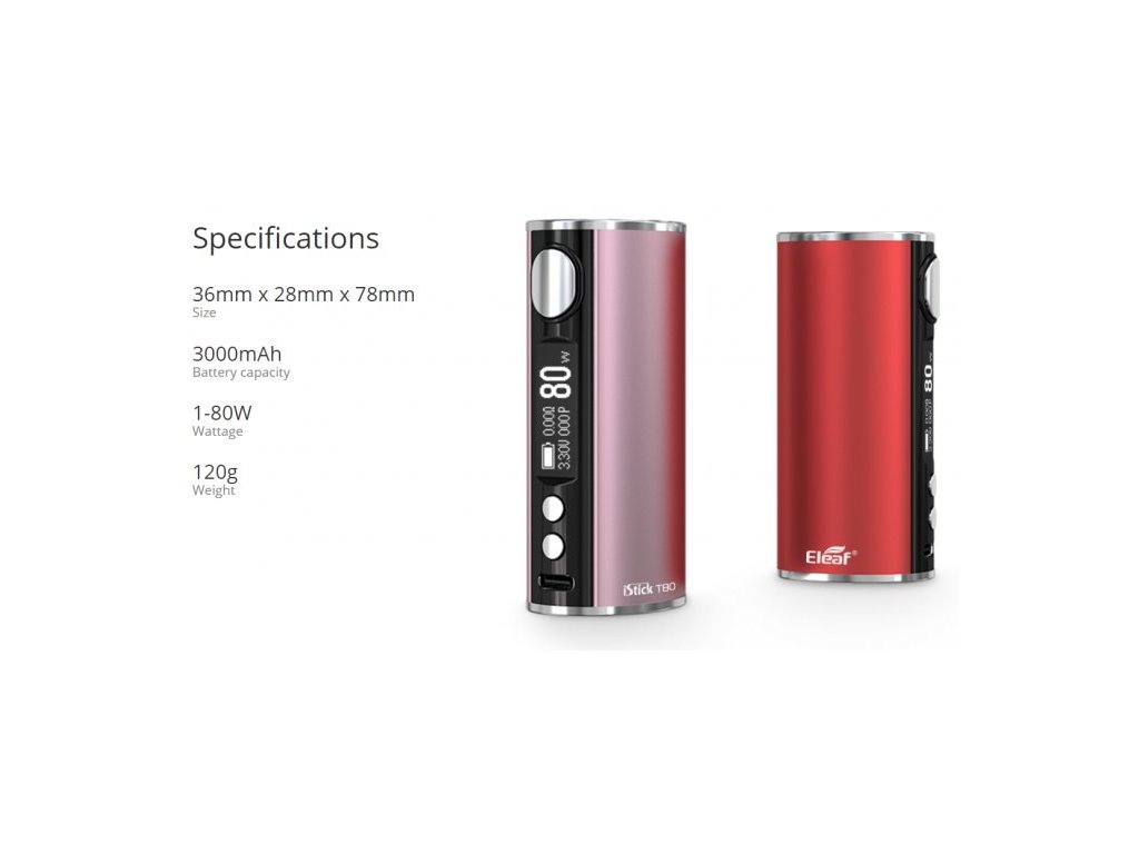iStick T80 je novým členem nejpopulárnější a nejoblíbenější řady gripů od Eleaf. Celokovové tělo ukrývá vestavěnou baterii o kapacitě 3000mAh, která je podporována inovativním systémem rychlého nabíjení QC3.0 s dobou nabíjení pouhých 90-ti minut. iStick T80 nabízí nastavitelný výkon až 80W. Přehledný OLED displej nabízí detailní informace o nastavení. Mezi jeho další přednosti patří ochrana proti zkratu, přehřátí, přežhavení, nízkému odporu a 10-ti vteřinová ochrana žhavení... Více info v detailním nastavení