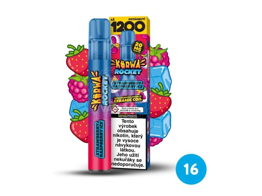 Strawberry Raspberry Ice s chutí sladkých jahod a příjemně kyselých malin, které příjemně doplňují osvěžující tóny coolády. Kurwa Rocket je jednorázová e-cigareta s obrovskou výdrží až 1200 potahů. Díky tak velké výdrží disponuje zejména kvůli keramické žhavící cívce a tedy rovnoměrnému a pozvolnému odpařování e-liquidu. Keramická cívka také mnohem lépe přenáší chuť a vytváří hustší páru.